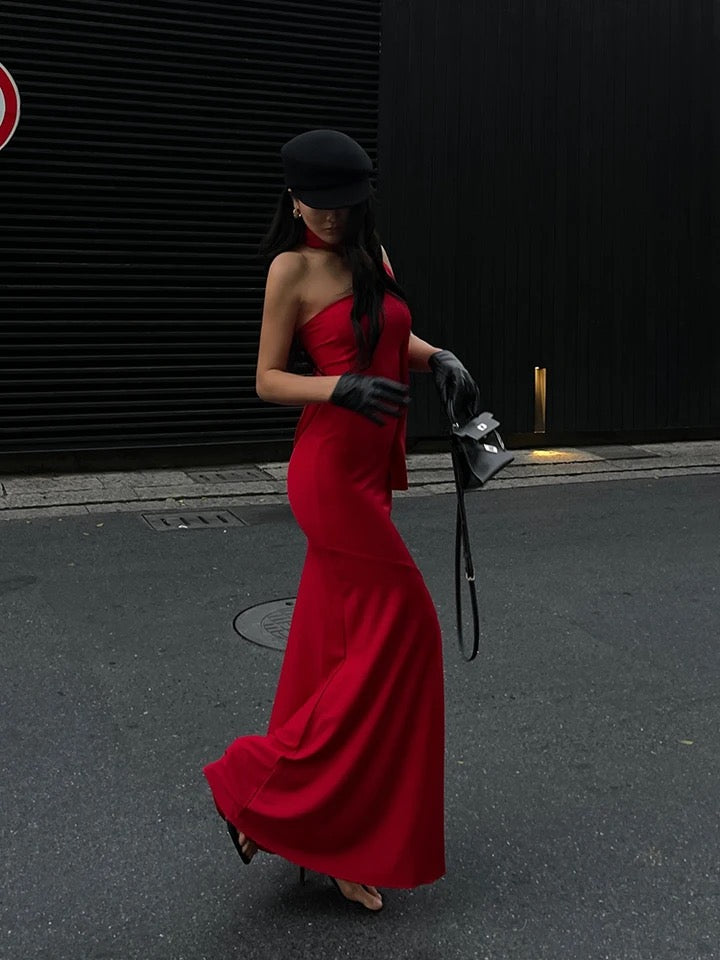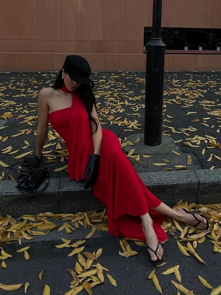 Alamea Offshoulder Statement Dress with Scarf in Red