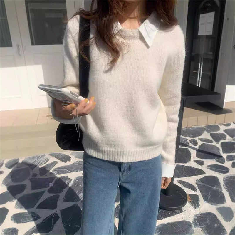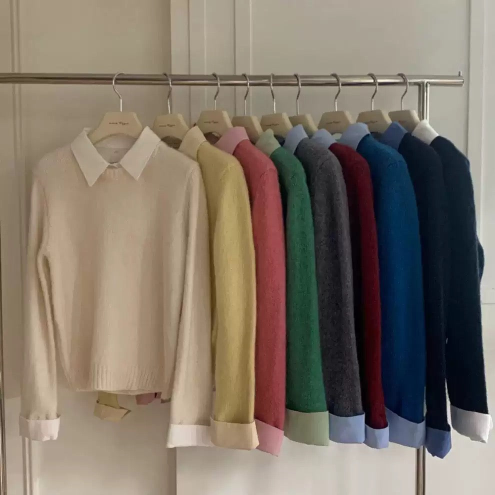 Designed with a contrast white shirt collar and cuffs seamlessly attached to a cozy navy sweater overlay that combines the polish of a shirt with the warmth of a sweater, making it an instant wardrobe essential for fall and winter. Perfect for work, brunch, or casual evenings.