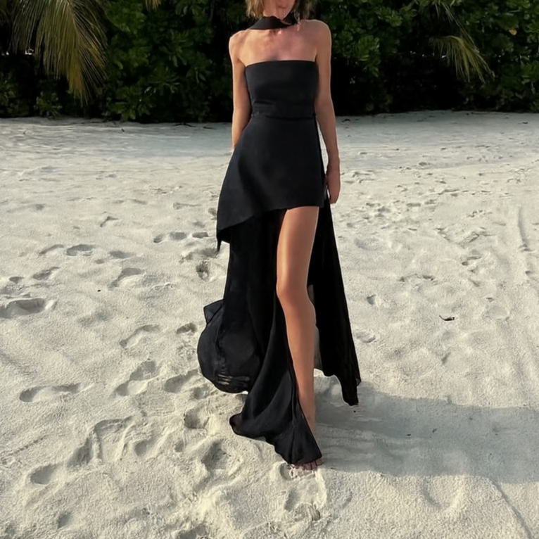Designed this statement dress features a off-shoulder, asymmetric layered detailing, and a sheer maxi length for a touch of modern romance. Complete with a matching scarf that doubles as a chic accessory.