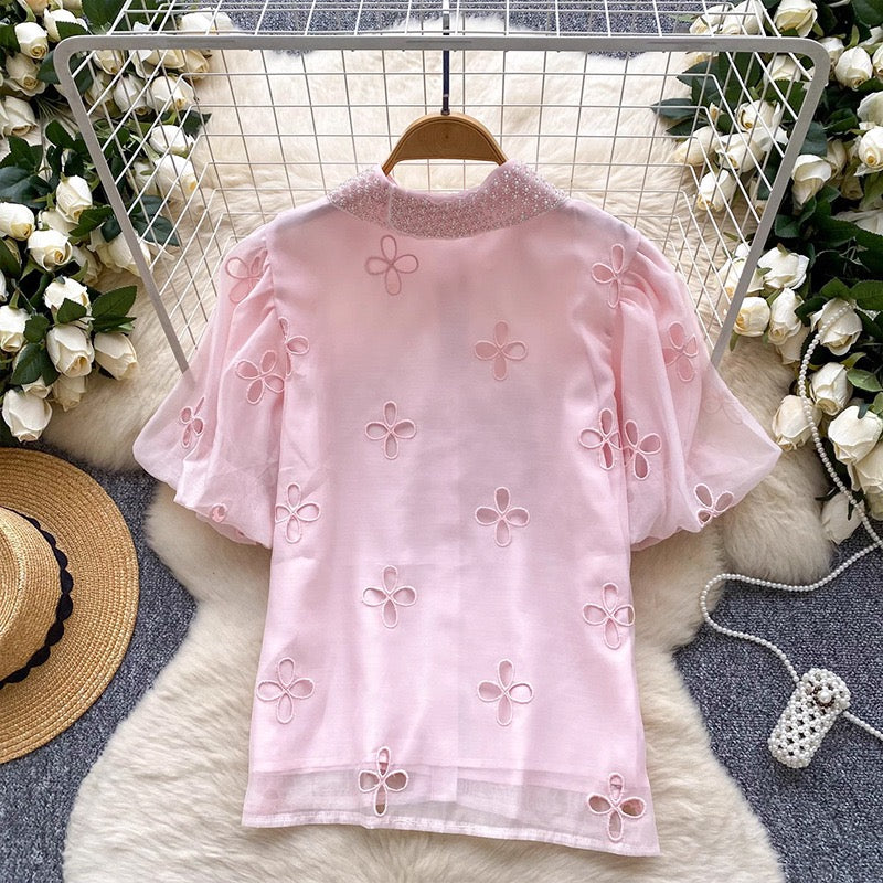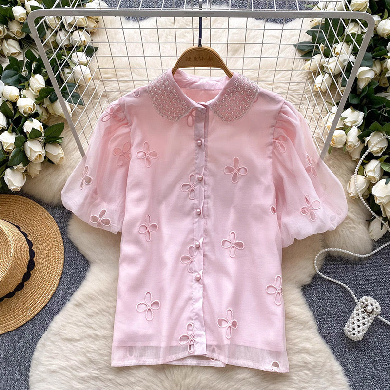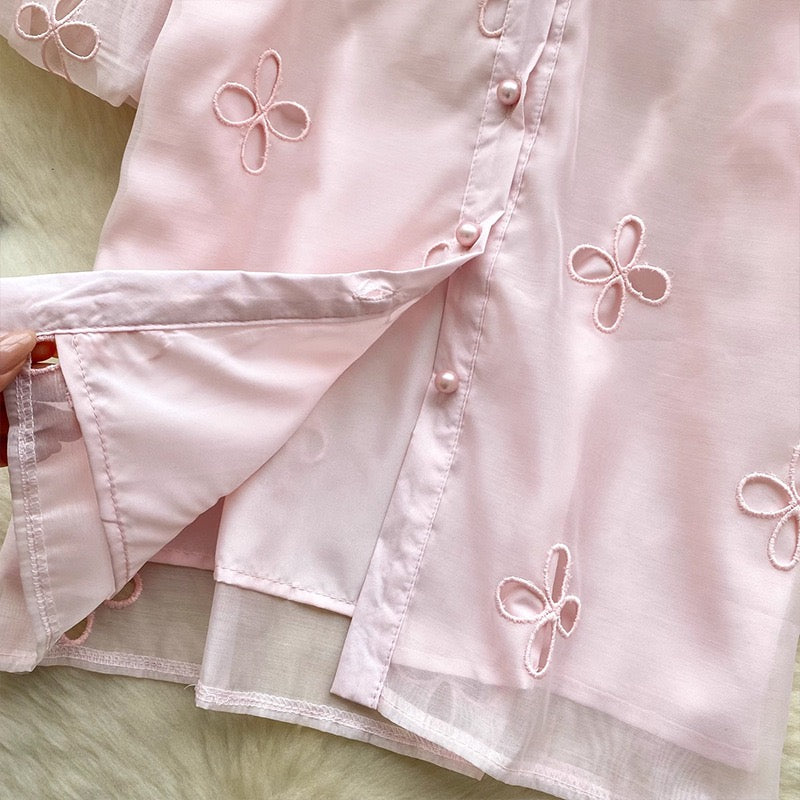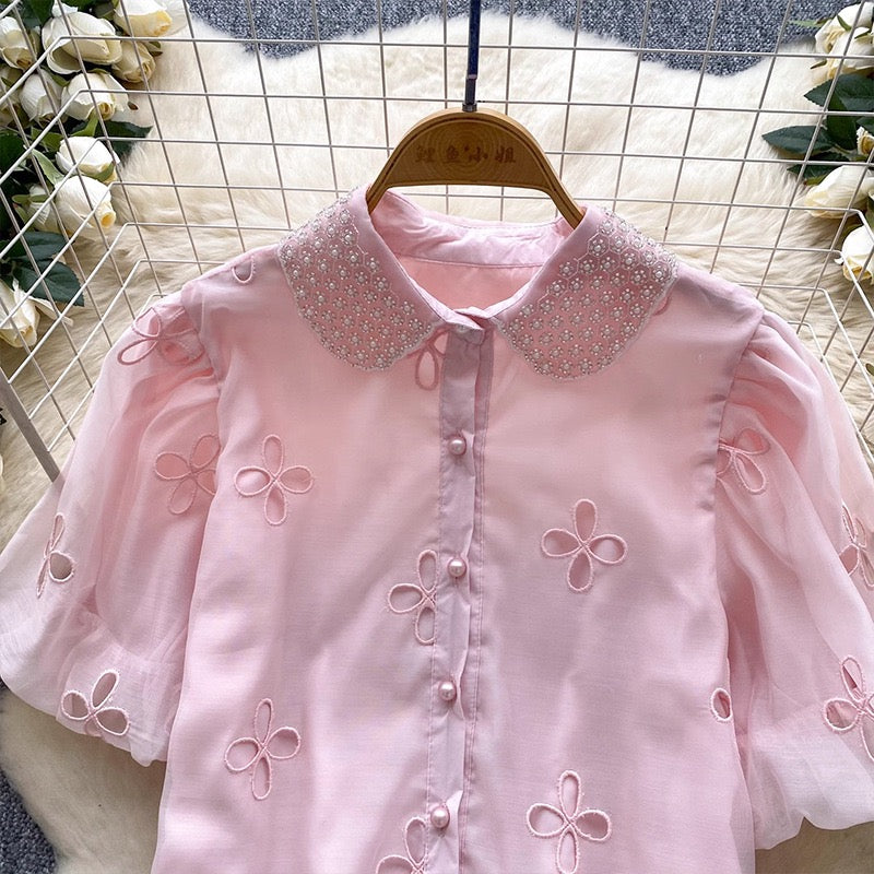 Elevate your wardrobe with Elea Top, crafted in lightweight organza fabric for a sheer, elegant look. Designed with delicate floral embroidery and a sparkling embellished Peter Pan collar, this chic pink blouse is the perfect mix of timeless femininity and modern sophistication.
