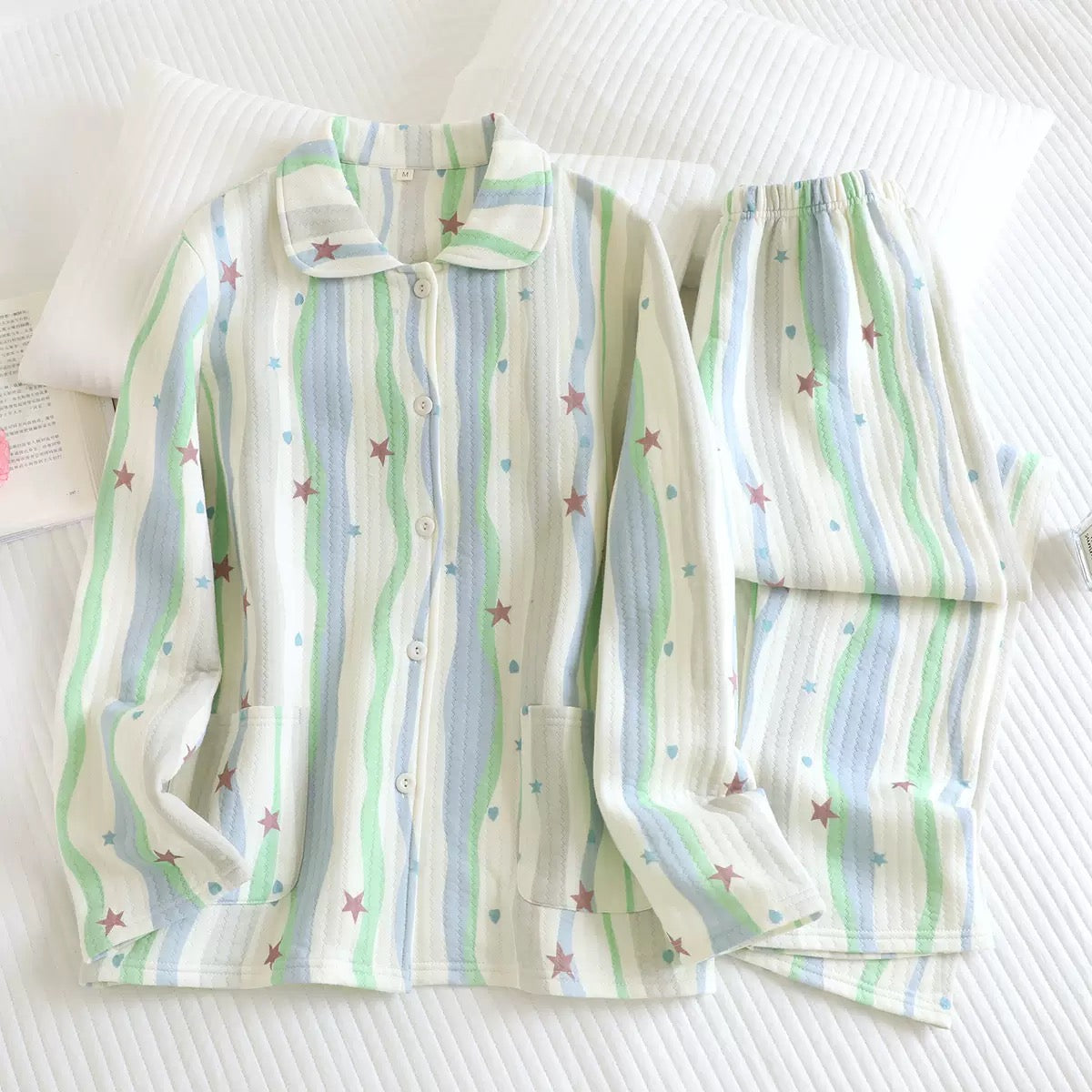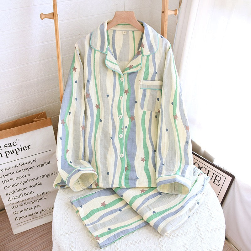 Designed in a relaxed fit, this button-down pajama set features soothing pastel stripes with playful star motifs, adding a fun yet cozy vibe to your bedtime look.