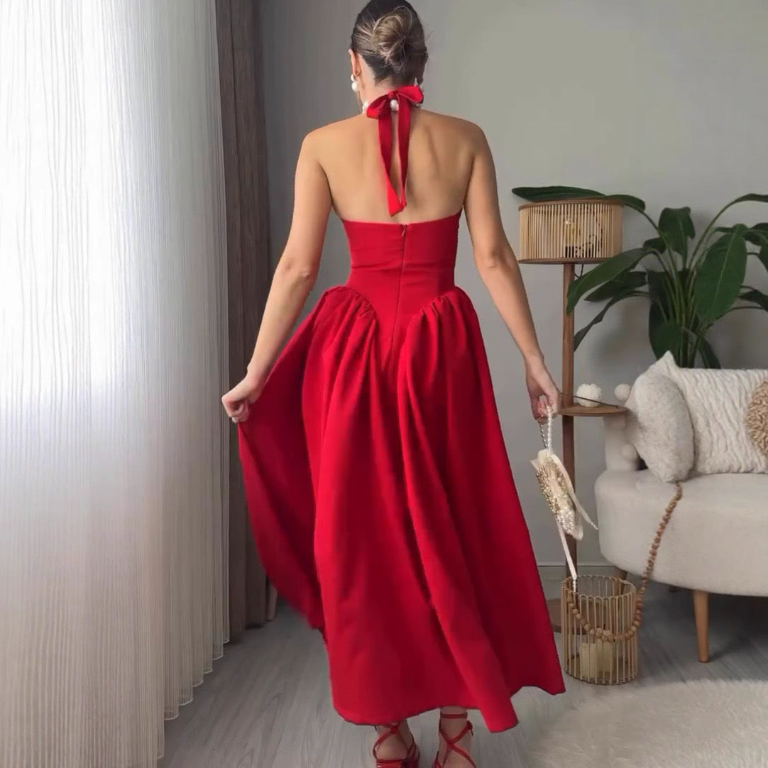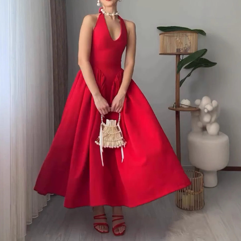 Designed with a plunging neckline, halter straps, and a dramatic drop-waist silhouette, this red midi dress flows into a voluminous skirt that moves with effortless grace. Perfect for cocktail parties, date nights, or special occasions.