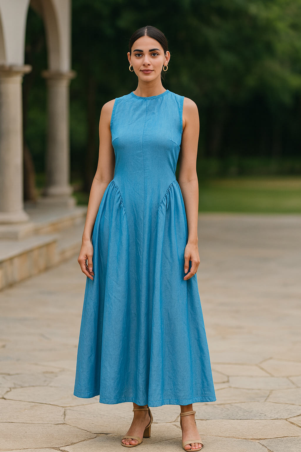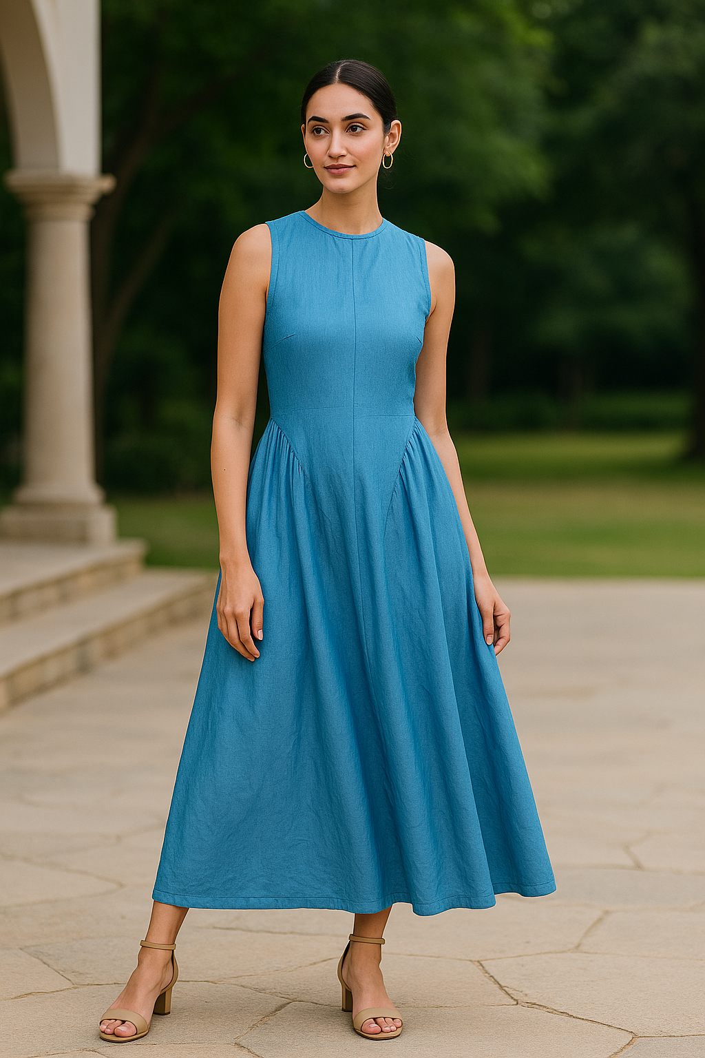 Featuring a flattering drop waist, sleeveless cut, and flowy midi length dress is perfect for brunches, holidays, or evening outings. Crafted in breathable fabric, it combines comfort with sophistication.