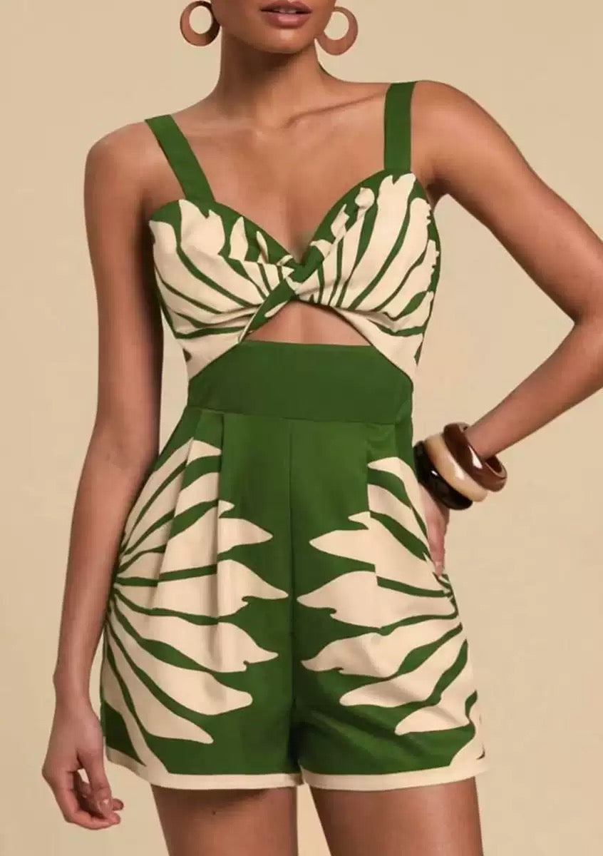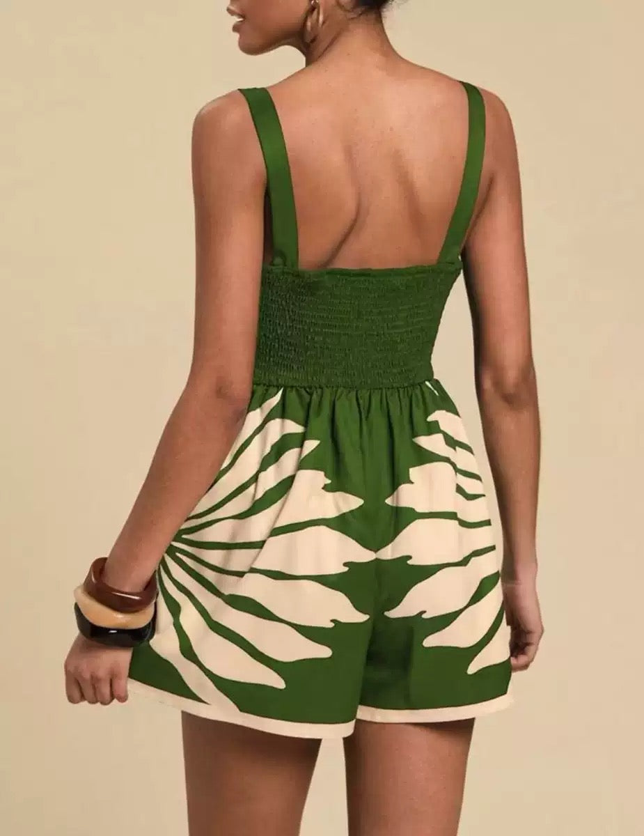 Say hello to your new go-to vacation piece. Designed with a tropical palm print and structured waist, this romper brings easy elegance to your warm weather days.