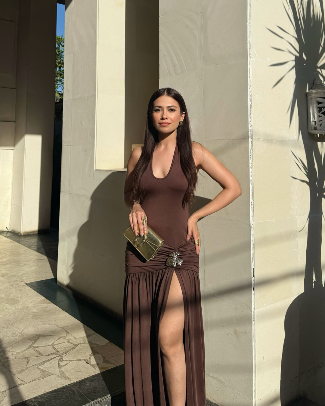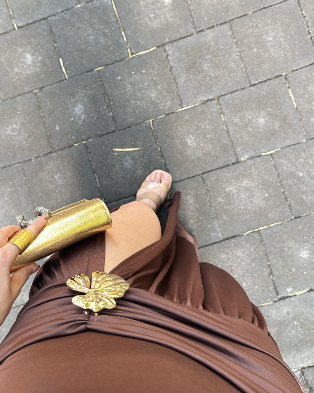 Serafina Luxe Slit Cut Maxi Dress In Brown