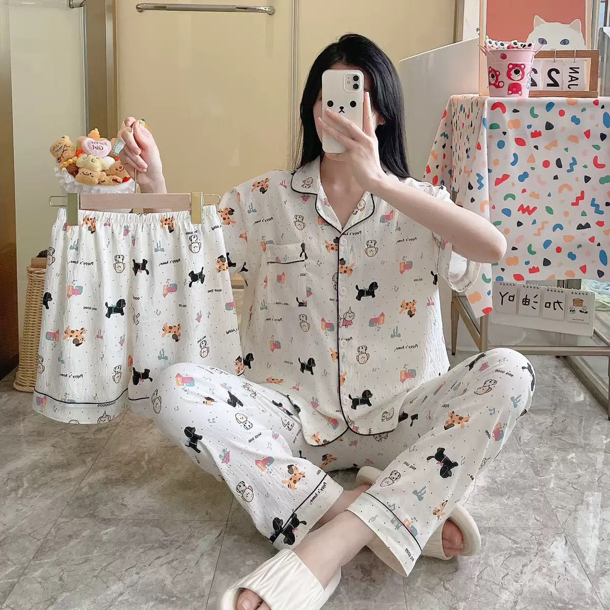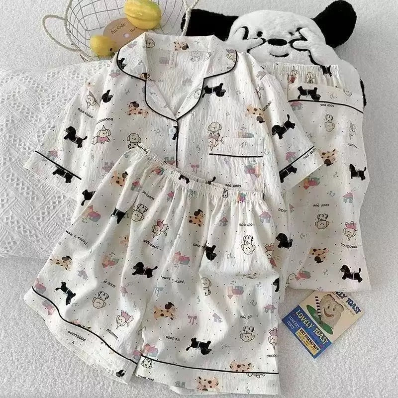 Vega loungewear set includes a short-sleeve button-down shirt, relaxed-fit pajama pants, and matching shorts that giving the flexibility to switch between cozy and breezy. With its adorable cartoon dog prints and soft finish, it’s the perfect cotton nightsuit for women to lounge, sleep, or chill in all day.