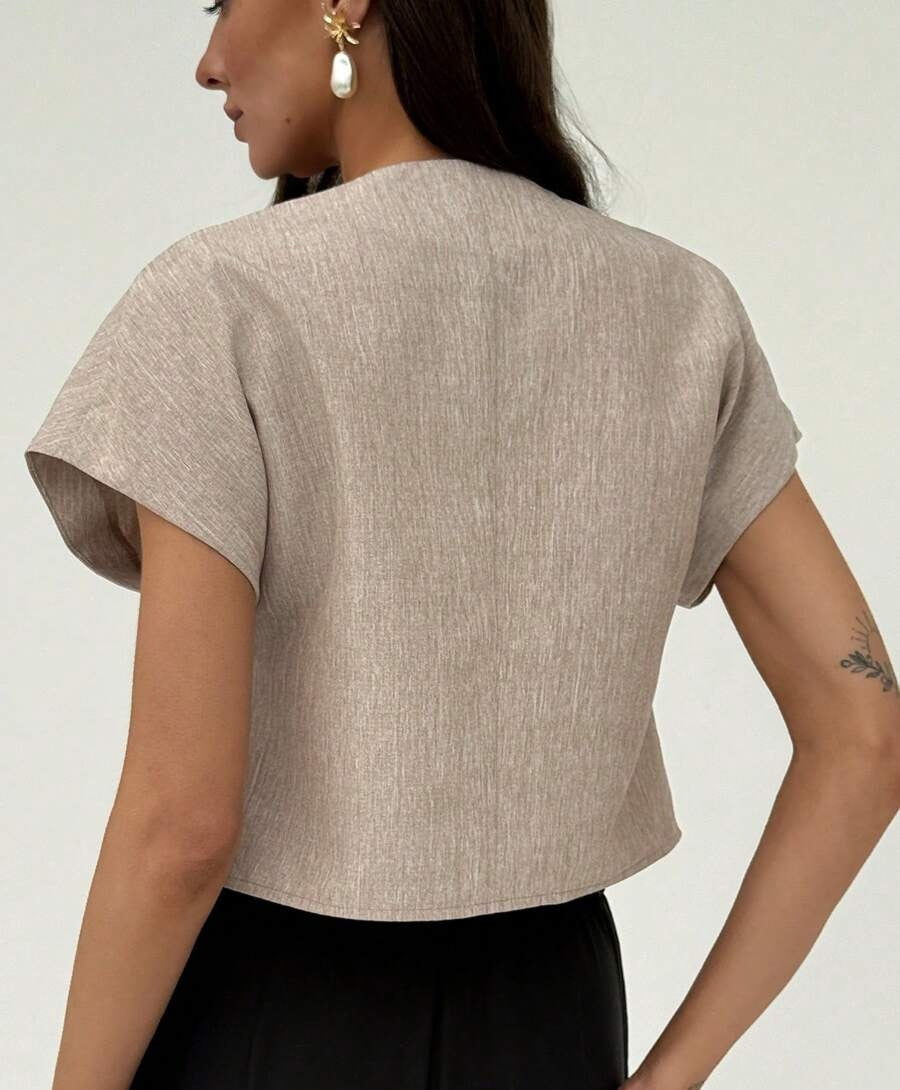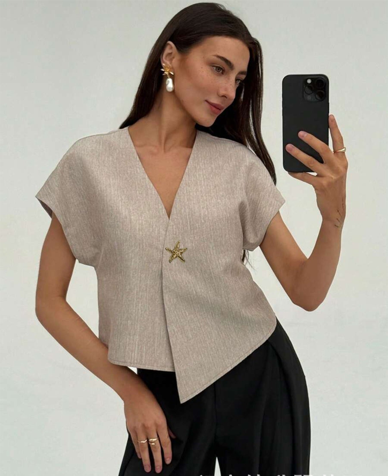 Crafted in a neutral tone, this top features a structured V-neck silhouette and star-shaped button accent, adding a touch of celestial charm and making it more than just a basic.
